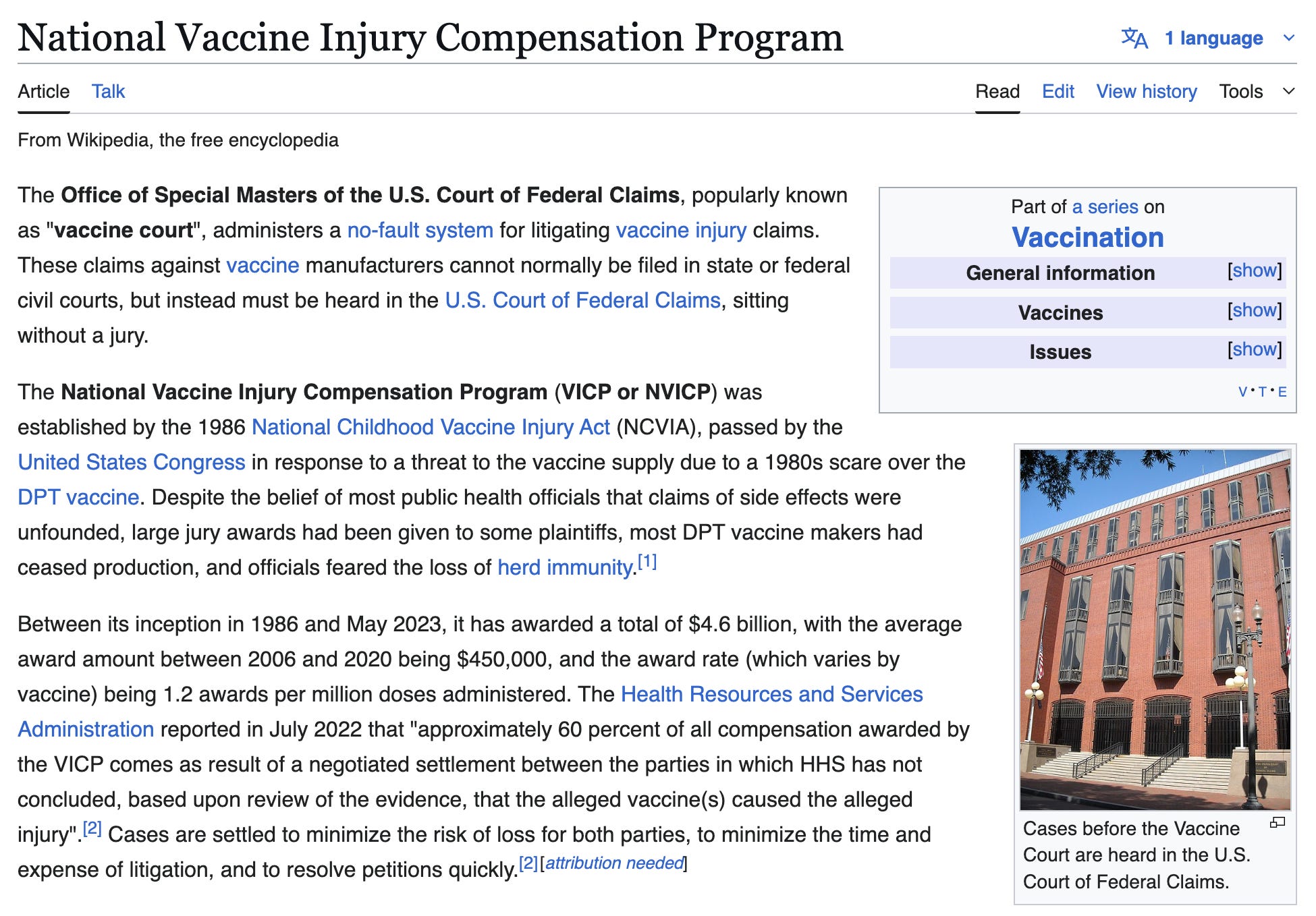 Over 39 years, the VICP has awarded just $5.4 billion to 12,000 victims. That comes out to about “1.2 awards per million doses administered.”