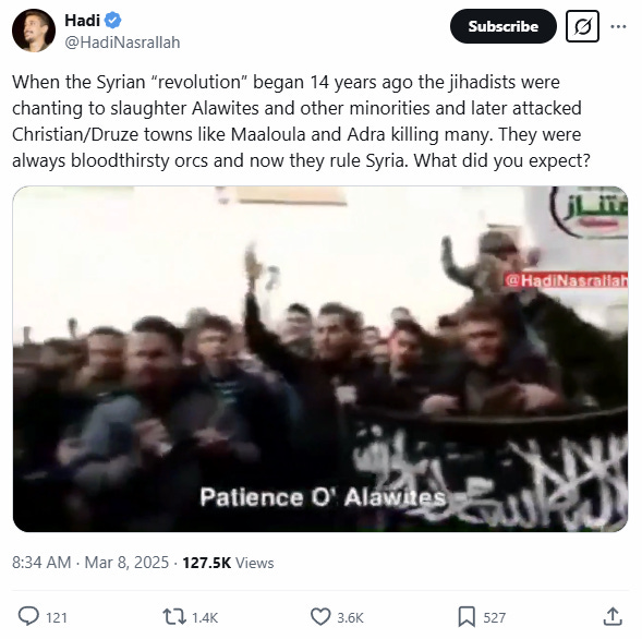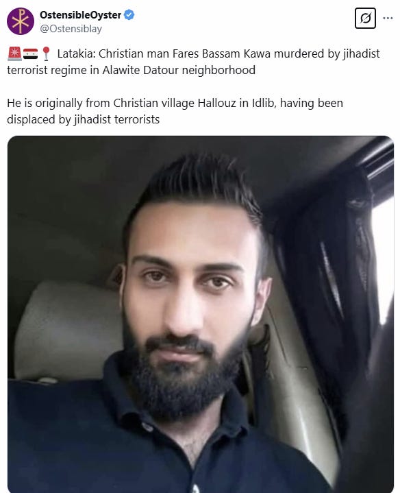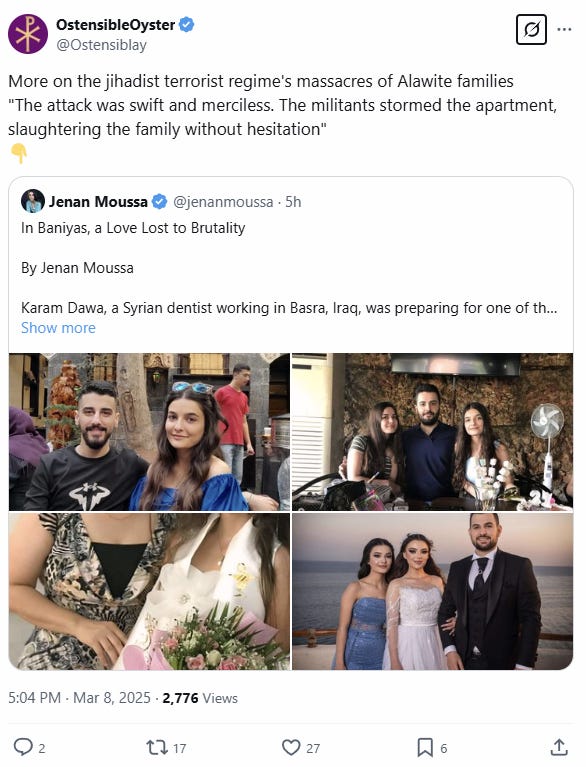 Update(1905ET): After several days of radical Sunni Islamist militants targeting religious minorities in Syria for mass killings, mainly in coastal areas, the mainstream media has belatedly begun to cover it (as the killings are growing to the point of getting too hard to ignore. Some correspondents estimated that there are thousands dead, mostly Alawites but also Syrian Christians among them, as post-Assad Syria unravels under Hayat Tahrir al-Sham’s (HTS) Jolani.