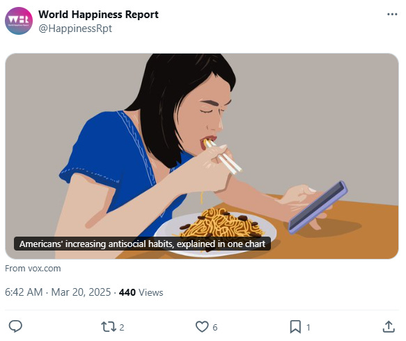 The report cited an increase in anti-social behaviour, including eating alone, as a cause of unhappiness in the US.