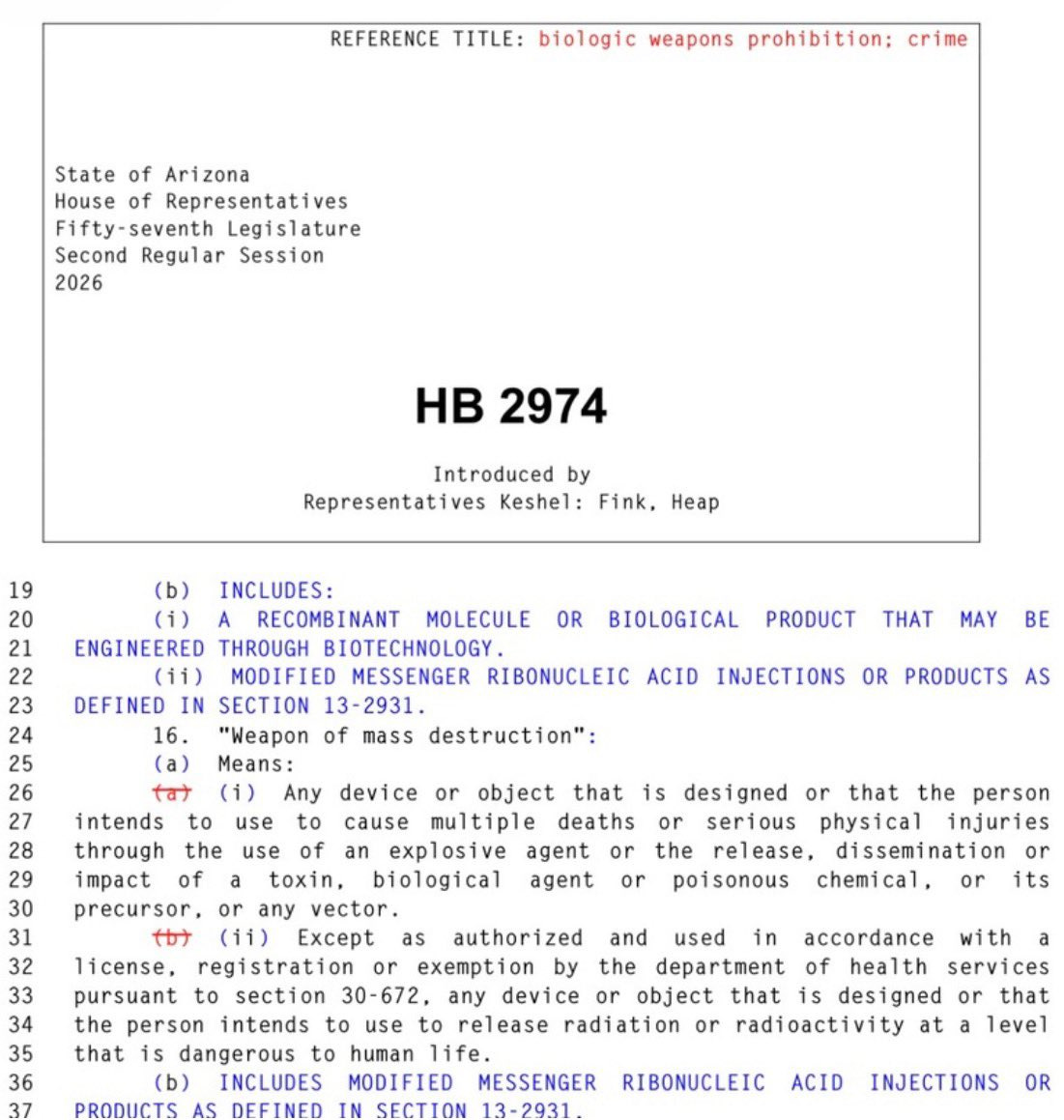 A bill introduced in the Arizona House of Representatives would classify modified messenger RNA (mRNA) injections and products as biological agents, weapons of mass destruction, and acts of terrorism, while making their manufacture, possession, or distribution a Class 2 felony under state law.