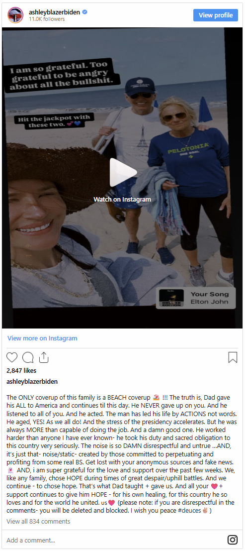 “The ONLY coverup of this family is a BEACH coverup,” Ashley Biden wrote. “The truth is, Dad gave his ALL to America and continues ’til this day.”