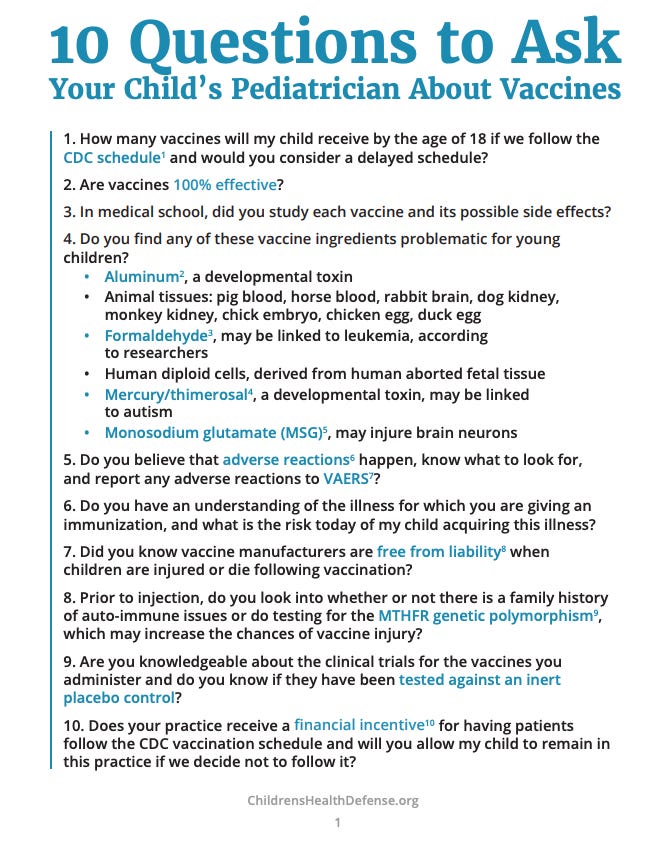 For parents with newborns and young children, Children's Health Defense (Notably, RFK Jr. served as chair of CHD's board from 2015 to 2023) offers ten questions to ask your doctor or pediatrician...