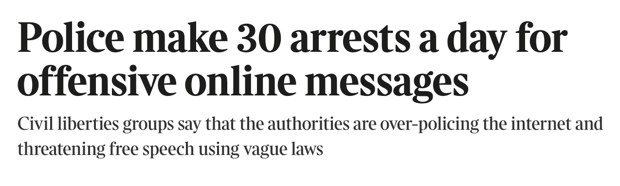 In the UK, police make over 30 arrests a day for “offensive” online messages under broad communications laws, which goes to show just how fast speech rules can get out of control.