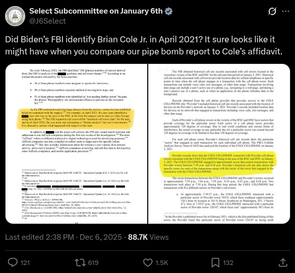 The affidavit released by Kash Patel’s FBI revealed Biden’s FBI had to have known Brian Cole was the pipe bomb suspect.