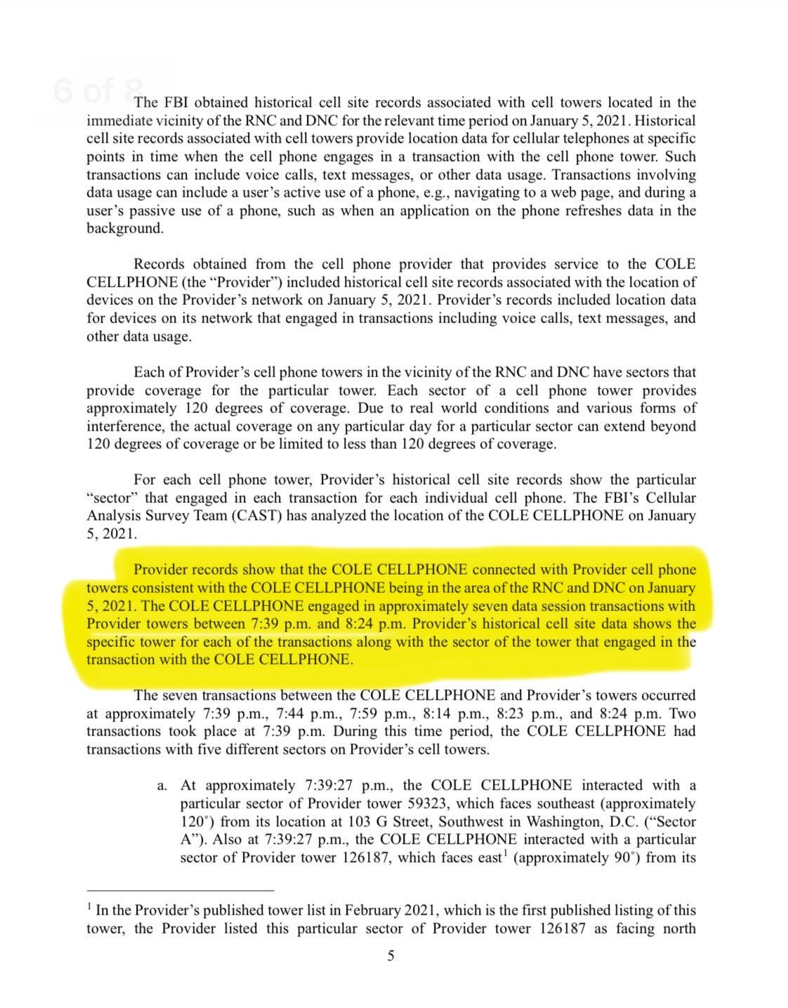 “Provider records show that the COLE CELLPHONE connected with Provider cell phone towers consistent with the COLE CELLPHONE being in the area of the RNC and DNC on January 2, 2021. The COLE CELLPHONE engage in approximately seven data session transactions with Provider towers between 7:39 p.m. and 8:24 p.m. Provider’s historical cell site data shows the specific tower for each of the transactions along with the sector of the tower that engaged in the transaction with the COLE CELLPHONE,” the affidavit said.