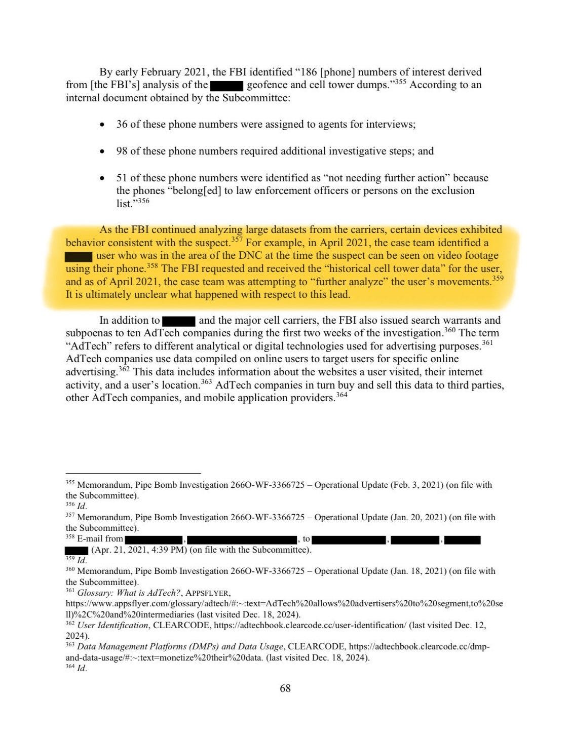 [In] April 2021, the case team identified a [redacted] user who was in the area of the DNC at the time the suspect can be seen on video footage using their phone. The FBI requested and received the “historical cell tower data” for he user and as of April 2021, the case team was attempting to “further analyze” the user’s movements. It is ultimately unclear what happened with respect to this lead,” the J6 Committee’s pipe bomb report read.