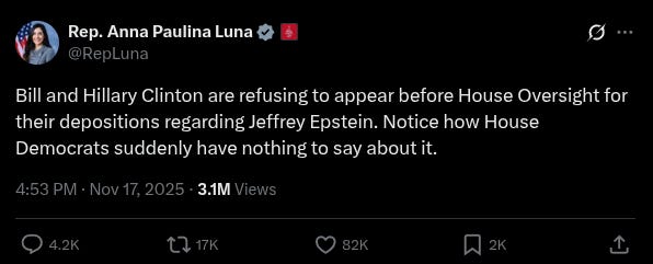 âBill and Hillary Clinton are refusing to appear before House Oversight for their depositions regarding Jeffrey Epstein. Notice how House Democrats suddenly have nothing to say about it,â Rep. Luna wrote on X.