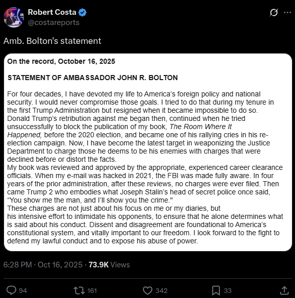 “Then came Trump 2 who embodies what Joseph Stalin’s head of secret police once said, “You show me the man, and I’ll show you the crime,’” Bolton said. “Dissent and disagreement are foundational to America’s constitutional system, and vitally important to our freedom.”