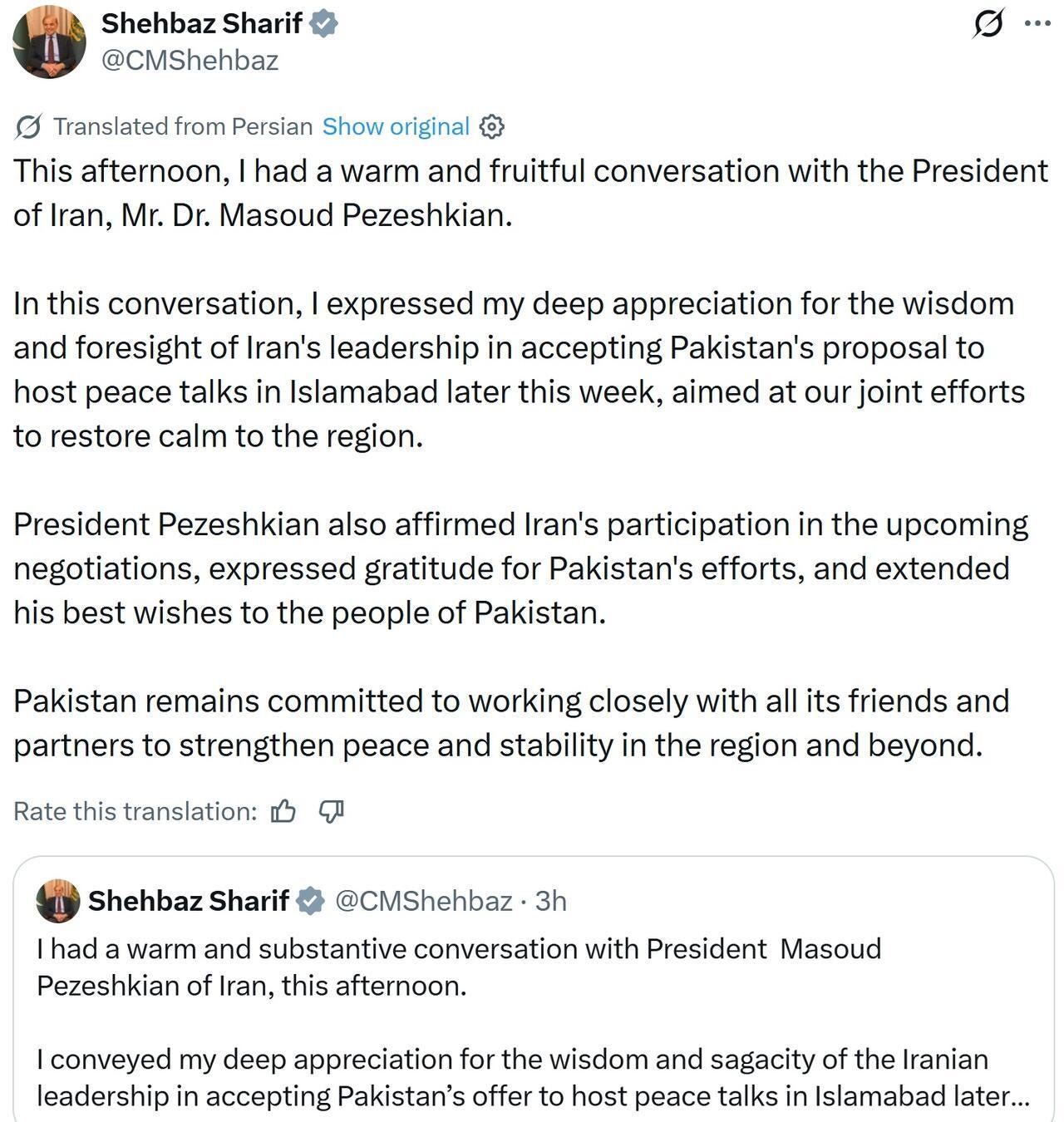 He said of a talk with the Iranian president, “I expressed my deep appreciation for the wisdom and foresight of Iran’s leadership in accepting Pakistan’s proposal to host peace talks in Islamabad later this week, aimed at our joint efforts to restore calm to the region. President Pezeshkian also affirmed Iran’s participation in the upcoming negotiations, expressed gratitude for Pakistan’s efforts, and extended his best wishes to the people of Pakistan.”