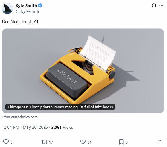 "Huge mistake on my part and has nothing to do with the Sun-Times," a contrite Buscaglia told NPR. "They trust that the content they purchase is accurate and I betrayed that trust. It's on me 100 percent." He told The Atlantic that he does his freelance work late at night; in his day job, he's a corporate editor and proofreader for AT&T. Remarkably, he implied that his customers must assume he's completely reliant on AI tools, to the extent that brought this weekend's humiliation to the Sun-Times, the Inquirer, King Features and himself.