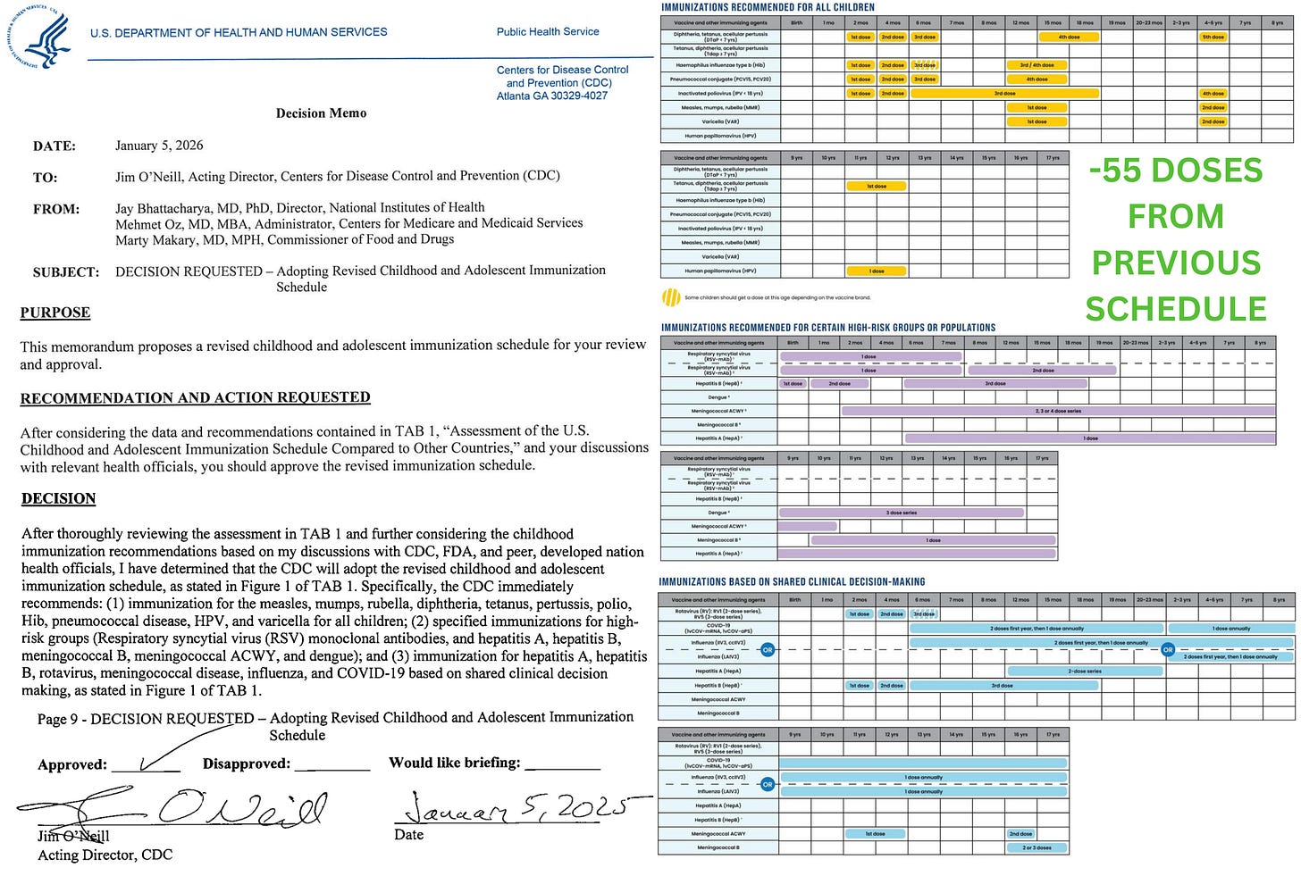The CDC has eliminated every non-consensus vaccine from the routine childhood schedule, cutting routine exposure by approximately 55 doses—an implicit admission that the safety of the expanded schedule was never adequately established.