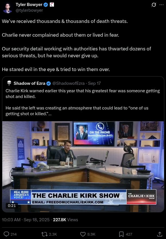 Turning Point USA’s Chief Operating Officer, Tyler Bowyer shared the footage Thursday, confirming that “thousands” of death threats were received but that Kirk refused to live in fear.