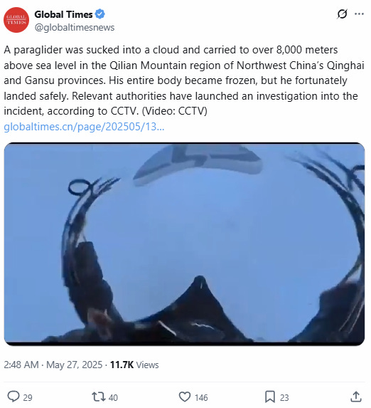 “The paraglider, identified in local reports as Liu Ge, claims the icy ordeal unfolded after he set off on the flight over the Qilian Mountains in northern China on Saturday, the Global Times reported.