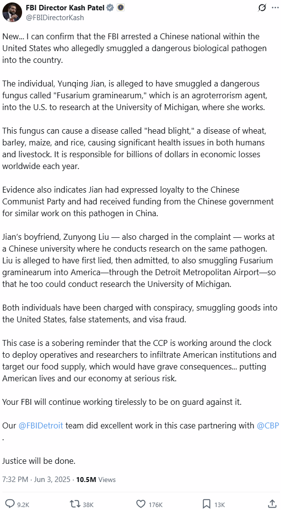 But the plot thickens. Electronic communications between Jian and Liu, uncovered by the FBI, suggest this wasn't a one-off. Messages from 2022 show Jian discussing how to smuggle biological materials past CBP, even boasting about hiding samples in her shoes during a previous trip. In early 2024, she reportedly arranged for an associate in China to mail a book with a plastic bag of material hidden inside. And then there's the kicker: Jian's phone contained a signed pledge of loyalty to the Chinese Communist Party (CCP), alongside evidence of funding from a Chinese government-backed foundation for her research on—surprise, surprise—Fusarium graminearum. Liu's phone wasn't clean either, harboring an article titled "2018 Plant-Pathogen Warfare Under Changing Climate Conditions," which explicitly flags the fungus as a crop-destroying threat.