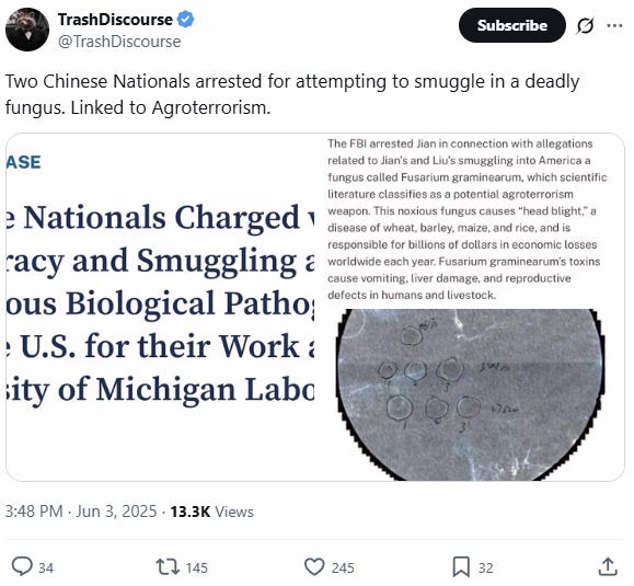 The story begins in July 2024, when Liu landed in Detroit on a tourist visa, claiming he was visiting his girlfriend. CBP officers, not buying the innocent tourist act, searched his luggage and found four plastic baggies stuffed with reddish plant material, later confirmed to be laced with Fusarium graminearum. Liu initially played dumb, insisting someone must have planted the stuff in his bag—a story that collapsed faster than China's commercial real estate bubble.
