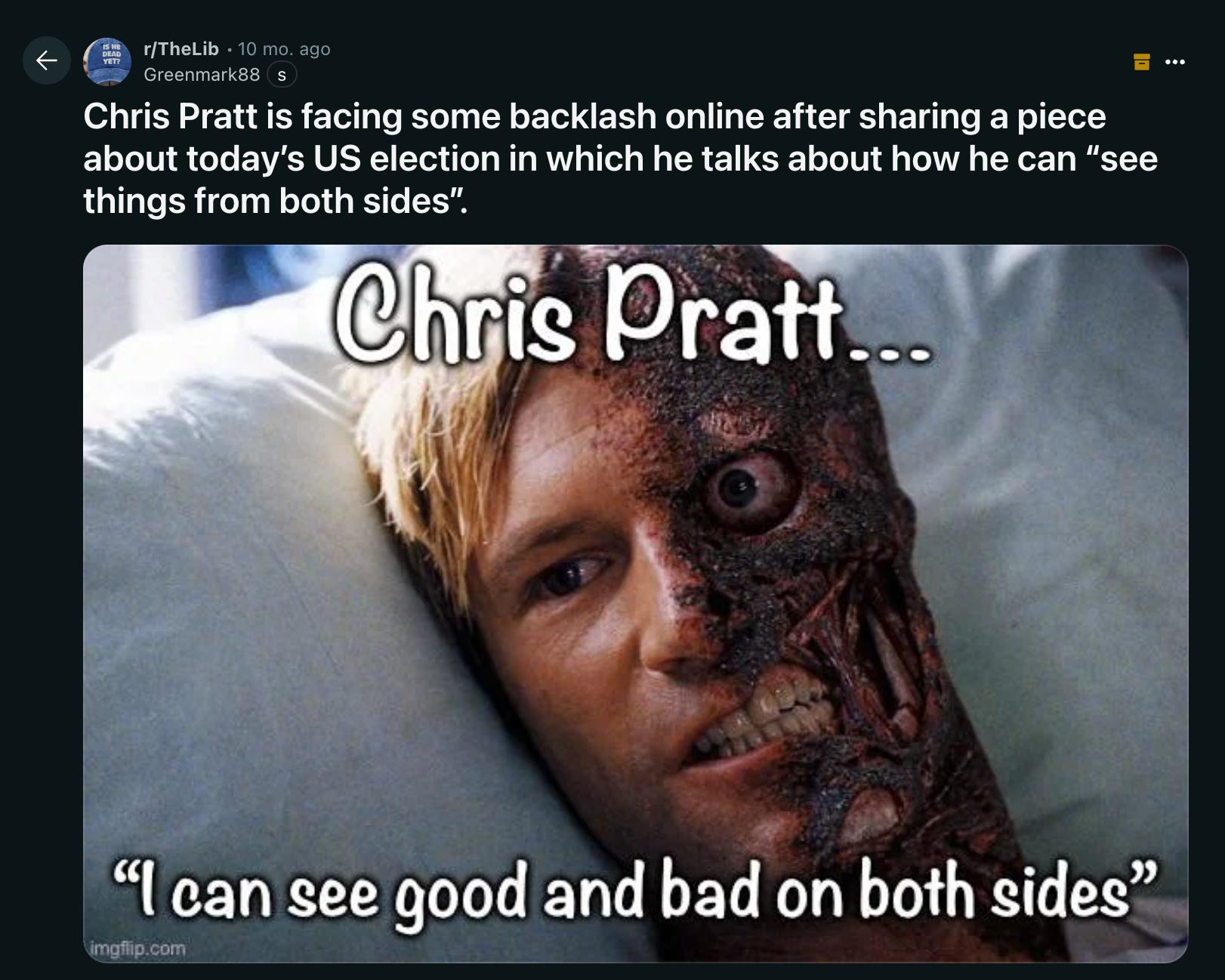Pratt isn’t known for politics—he tends to stay neutral on purpose.