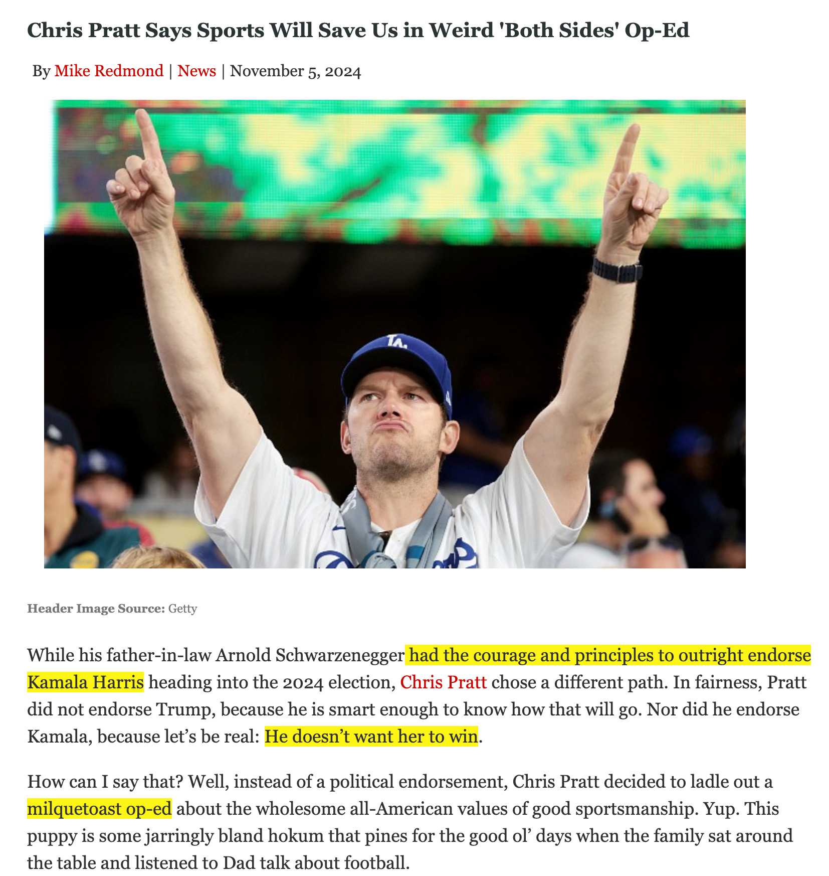 As expected, his refusal to take sides angered liberals. Columns surfaced mocking Pratt for being too “milquetoast” and lacking the “courage and principles to outright endorse Kamala Harris” like his father-in-law, Arnold Schwarzenegger, did.