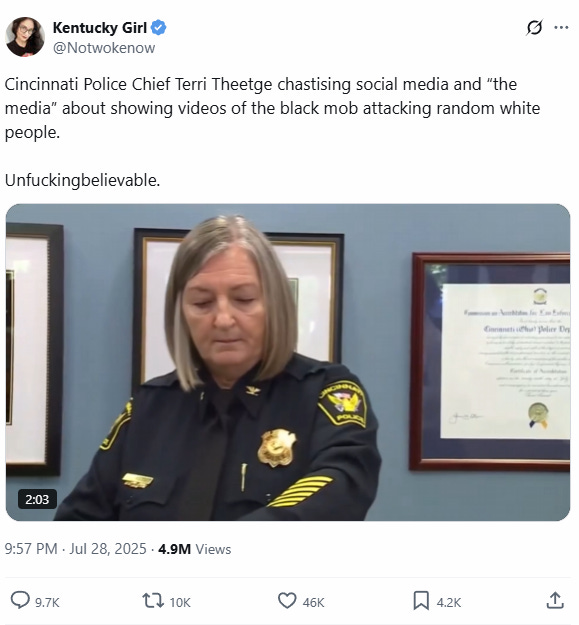 This comes on the heels of Cincinnati Police Chief Teresa Theetge's absurd attempt to downplay the Black mob assault, raising very serious concerns about the city's woke leadership.