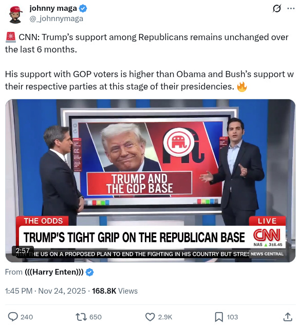 Critics argue that Trump’s problem going into mid-terms is not his base (even though the constant online narrative has been that his base is walking away from him). Rather, they say that disapproval among independents is going to undermine the slim MAGA majority in congress in 2026.