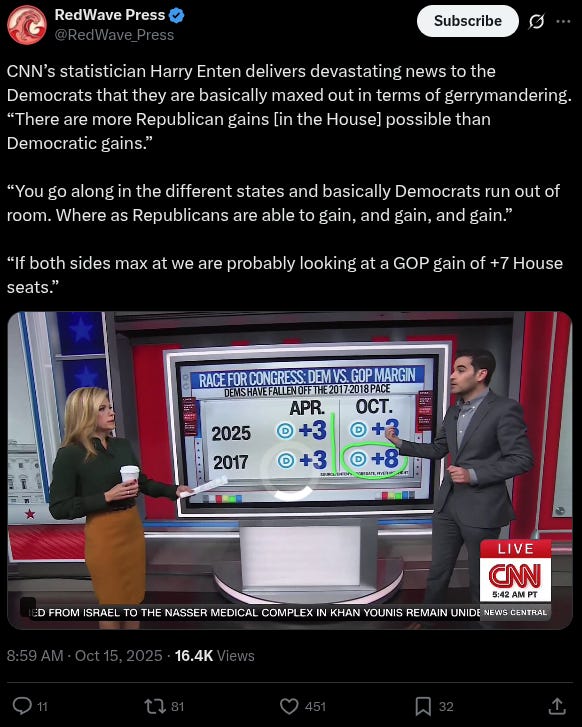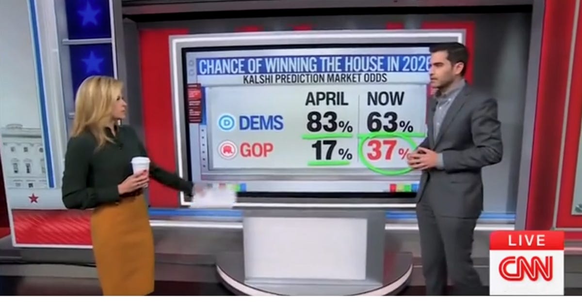 The Kalshi prediction market gave Republicans a 37% chance of keeping control of the chamber at the time of Enten’s “CNN News Central” segment, which the analyst noted was a substantial increase. He also said Democrats’ current advantage over Republicans in the generic congressional ballot significantly lags behind their October 2017 lead.