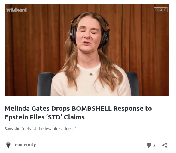 Melinda’s response on NPR’s Wild Card podcast lit the fuse for Mace. Melinda said Gates and other Epstein cronies “need to answer to those things.”