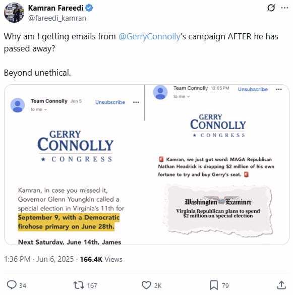 A tweet from Kamran Fareedi, a former FBI informant, revealed that he received fundraising emails from the campaign of Virginia Democratic Rep. Gerry Connolly after the congressman had passed away. Fareedi described the emails as “beyond unethical.”