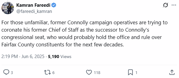 “For those unfamiliar, former Connolly campaign operatives are trying to coronate his former Chief of Staff as the successor to Connolly’s congressional seat, who would probably hold the office and rule over Fairfax County constituents for the next few decades,” Kamram posted.