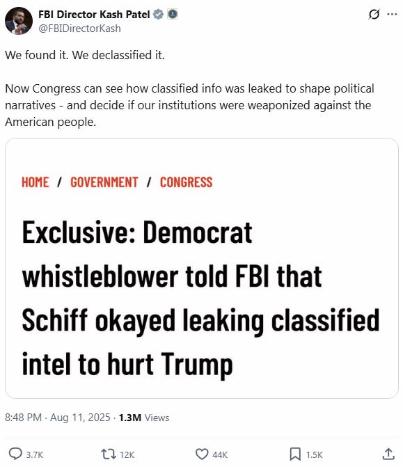 A career intelligence officer who worked for Democrats on the House Intelligence Committee for more than a decade repeatedly warned the FBI beginning in 2017 that then-Rep. Adam Schiff had approved leaking classified information to smear then-President Donald Trump over the now-debunked Russiagate scandal, according to bombshell FBI memos that Director Kash Patel has turned over to Congress.