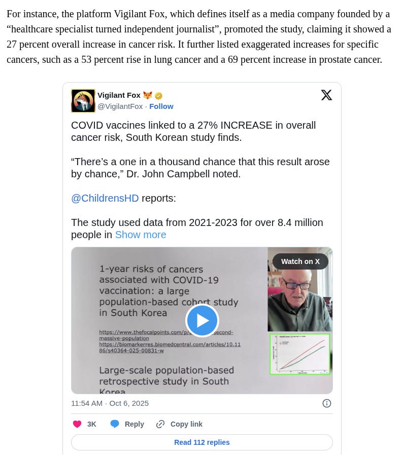 Nicolas Hulscher, MPH, who identifies himself as an “epidemiologist”, went further, falsely claiming that the vaccine increases the risk of “seven types of cancer”, linking the study to others without justification to assert that these cancers “all increased significantly after vaccination”.