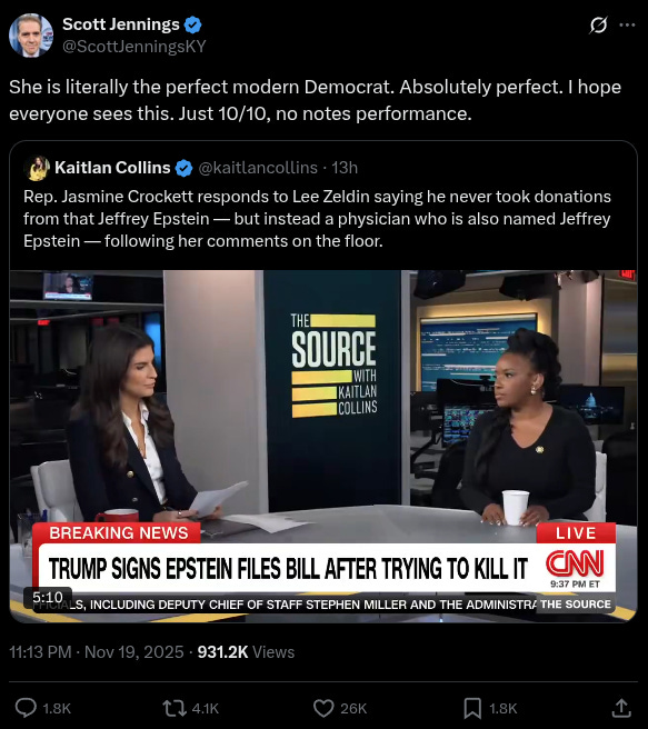 CNN’s Scott Jennings mocked the Texas Democrat on 𝕏, writing, “She is literally the perfect modern Democrat. Absolutely perfect. I hope everyone sees this. Just 10/10, no notes performance.”