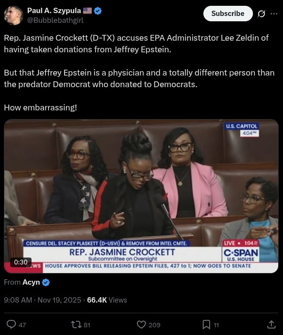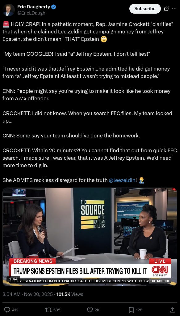 Crockett’s explanation is laughable as she would obviously never have mentioned the donation unless she believed it came from the child trafficker Epstein, not a random physician.