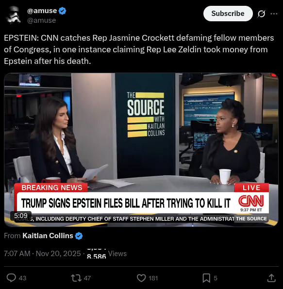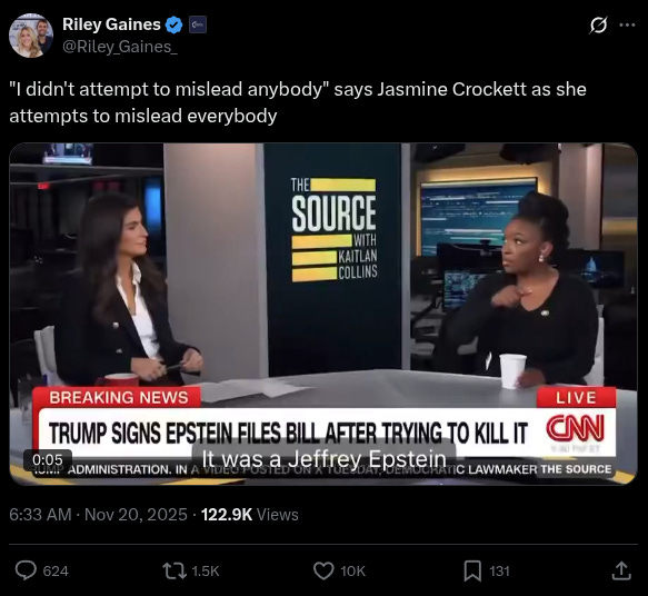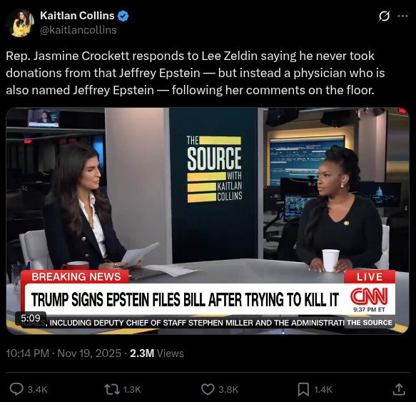 Responding to the mistake during a CNN interview, Crockett lied about her remarks by claiming she said “a Jeffrey Epstein” made the donations, but on the House floor she clearly said the Republicans “took money from somebody named Jeffrey Epstein.”