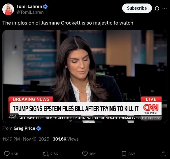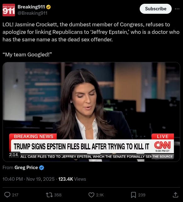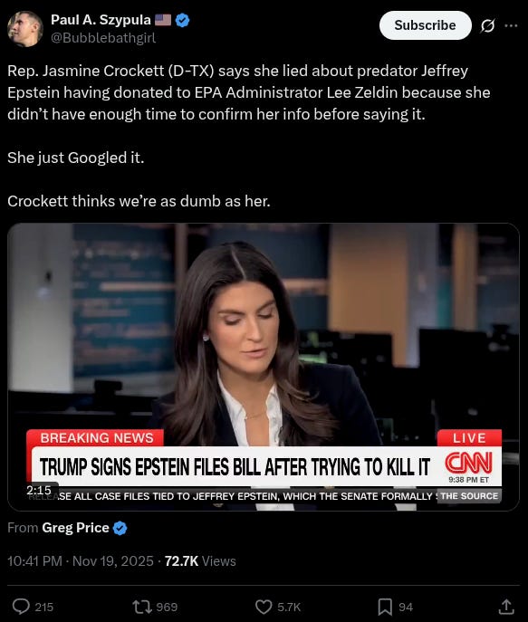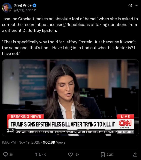 Dem Rep. Crockett Falsely Claims Trump Official Took Donations From Epstein, Lies in Botched Response
