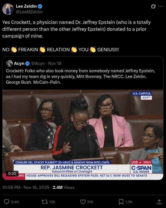 “Yes Crockett, a physician named Dr. Jeffrey Epstein (who is a totally different person than the other Jeffrey Epstein) donated to a prior campaign of mine,” Zeldin wrote on social media.