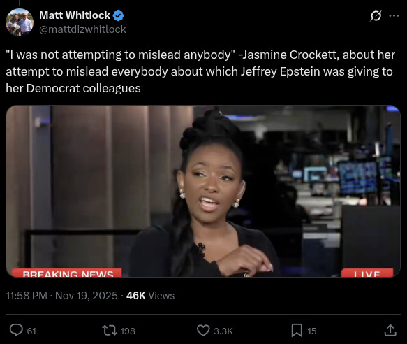 “Do you want to correct the record?” Collins asked, with Crockett absurdly replying, “I never said it was THAT Jeffrey Epstein. Just so that people understand, when you make a donation, your picture is not there. And because they decided to spring this on us, in real time, I wanted the Republicans to think about what could potentially happen, because I knew that they didn’t even try to go through the FEC.”