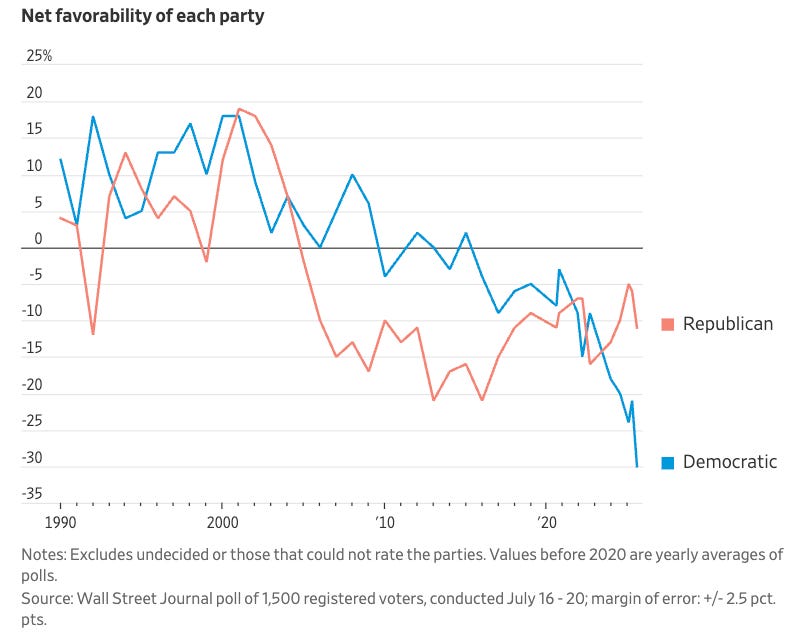 A new Wall Street Journal poll shows the Democratic Party's image has sunk to its lowest point in over three decades. About 63% of voters hold an unfavorable view of the party, the highest level since the survey began in 1990, while only 33% view it favorably.