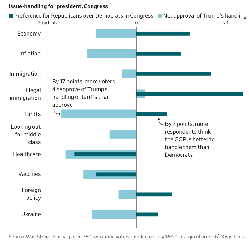 Overall, voters disapprove of Trump's handling of the economy, inflation, tariffs, and foreign policy. Yet, despite these concerns, the latest WSJ poll finds that voters still trust the GOP over Democrats to manage each of these issues in Congress.