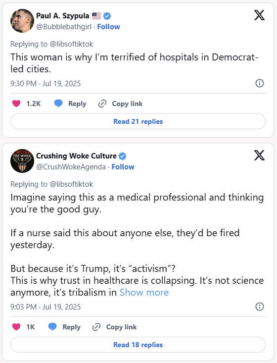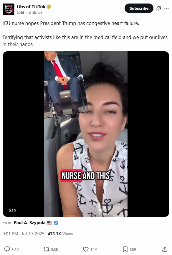 TDS can affect anyone at any time, and it can be deadly. Here’s another example of that. This woman is a nurse who works in an Intensive Care Unit. She’s supposed to save people’s lives, but when we’re talking Trump, she’s living in hope that he has heart failure and dies.