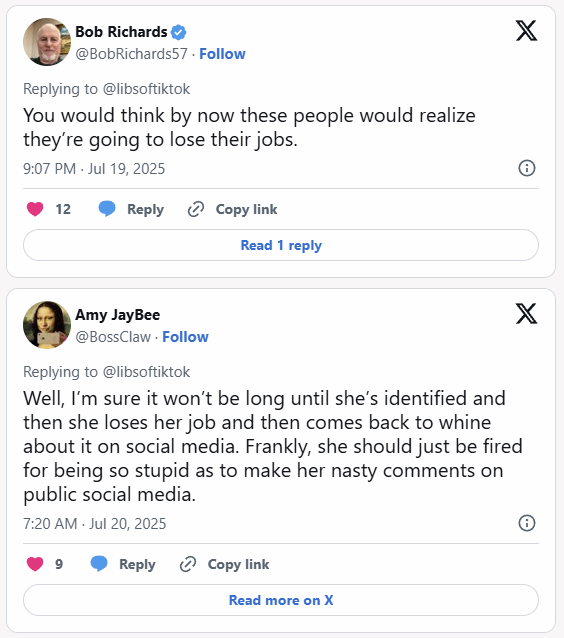 People online have identified her, and it can only be a matter of time before she is rightfully unemployed.
