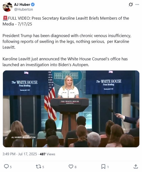 Last week, White House PS Karoline Leavitt announced that President Trump has been diagnosed with chronic venous insufficiency, a non-serious treatable condition that causes swelling in the legs.