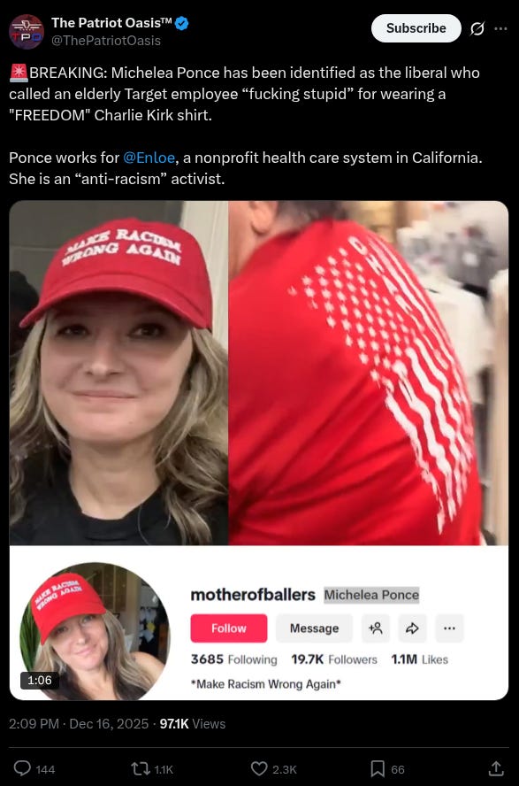 The video shows the worker calmly going about her duties in the clothing section, her red “FREEDOM” shirt emblazoned with an American flag sleeve and Kirk’s name. But peace was short-lived as a woman approached, launching into a foul mouthed tirade that reeks of the kind of unhinged rhetoric that’s become all too common from the left.