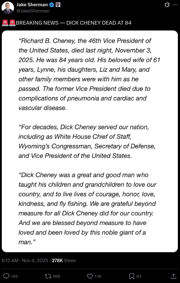 “Richard B. Cheney, the 46th Vice President of the United States, died last night, November 3, 2025. He was 84 years old. His beloved wife of 61 years, Lynne, his daughters, Liz and Mary, and other family members were with him as he passed. The former Vice President died due to complications of pneumonia and cardiac and vascular disease.