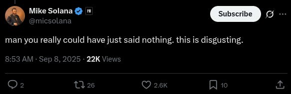 “Man you really could have just said nothing. This is disgusting,” Pirate Wire’s Mike Solana said.