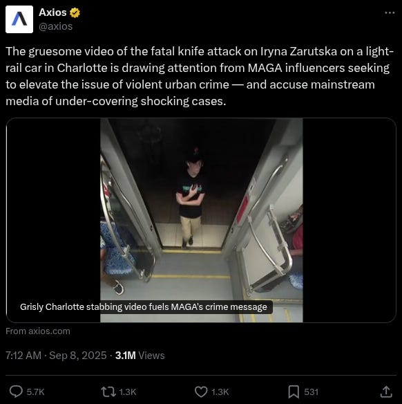 Surveillance footage released on Friday showed DeCarlos Brown, a homeless ex-convict with 14 prior court cases, fatally stabbing 23-year-old Iryna Zarutska on a light rail train on Aug. 22. After the media largely ignored this tragic incident, Axios published the piece, “Stabbing video fuels MAGA’s crime message,” to suggest that “MAGA influencers” are using this surveillance footage to draw “repeated attention” to violent crime.