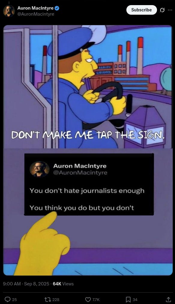 The article received intense backlash on X by conservatives who were outraged by the tragedy. Blaze Media podcaster and author Auron McIntyre posted a Simpsons meme with the words, “You don’t hate journalists enough. You think you do but you don’t.”