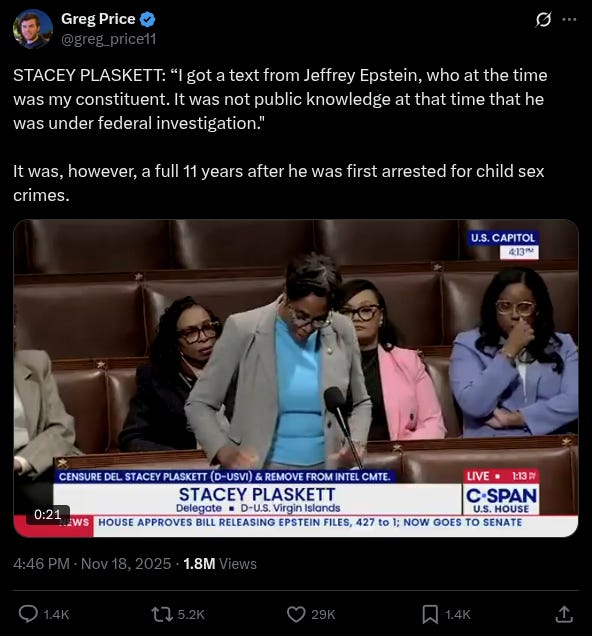“On Wednesday, Plaskett downplayed Epstein as just another ‘constituent’, after files released by Epstein’s estate revealed he fed her questions during a congressional hearing in 2019, prompting the call for the House sanction.