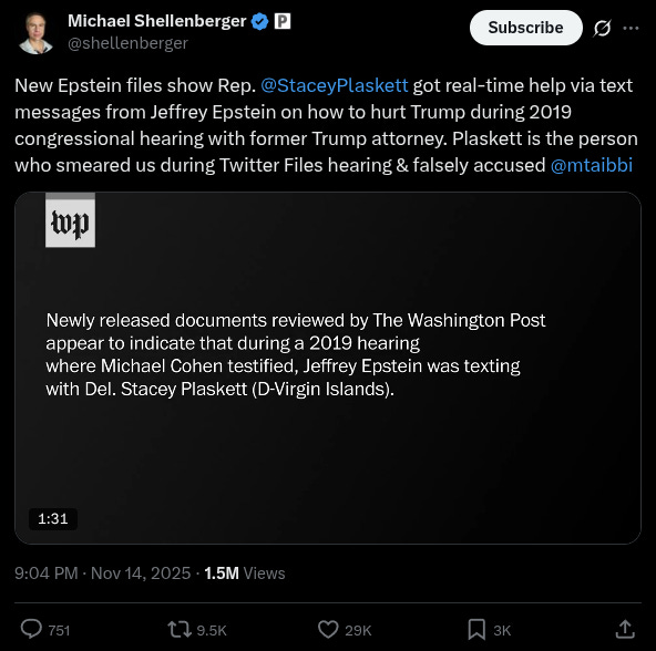 “Epstein and Plaskett were connected enough that he fed her questions and gave her real time help on how to damage President Trump’s reputation during a February 2019 House Oversight Committee hearing featuring former Trump fixer Michael Cohen.