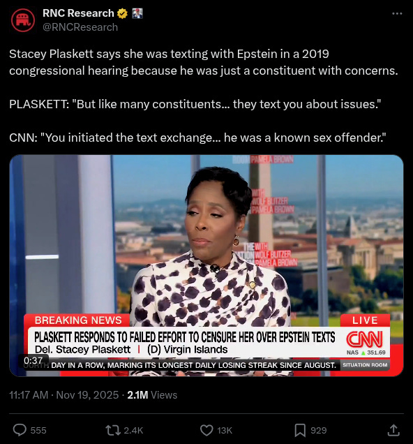Plaskett is being shown to have far deeper connections to Jeffrey Epstein – a major donor for her – than she let on.