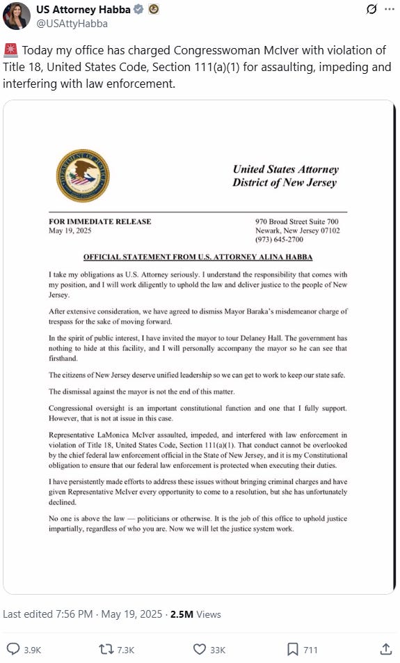 McIver was given ample opportunity to come to a peaceful resolution and avoid criminal charges, Habba said, but the congresswoman reportedly declined, Just the News reports. "No one is above the law — politicians or otherwise," said Habba. "It is the job of this office to uphold justice impartially, regardless of who you are."