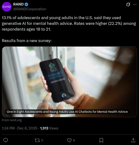 The disturbing trend isn’t confined to Britain’s failing socialist bureaucracy—it’s infecting America too, where one in eight adolescents and young adults are now turning to generative AI chatbots for mental health advice, according to a bombshell RAND Corporation survey.